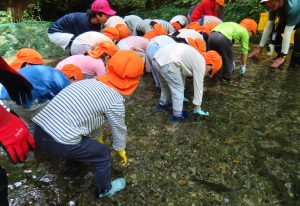 携帯も繋がらない秘境の森林散策、刈寄川でニジマスのつかみ取り! お昼ご飯は、スタッフの方に炭火で焼いていただいたニジマスを美味しくいただきました。