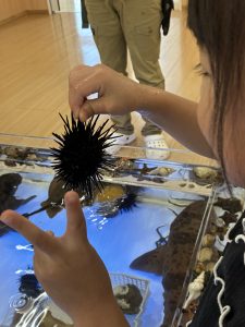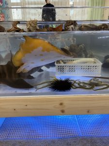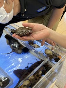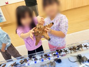 係の人に手に乗せてもらったり、触り方を教えてもらうと、小さな貝や、ヒトデから、大きなイセエビやタカアシガニ、サメのおなかや背中など、触らせてもらい、こどもたちの目はみんなキラキラと輝いていました。