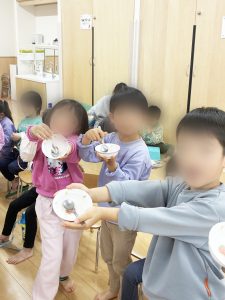 最初の一口は、我慢しきれず、大きな口でたべていたこども達。