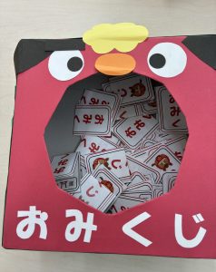 0~2歳児クラスのこどもたちは、クラスで、3~5歳児クラスのこどもたちは、縦割り3きょうだいで、はごいた、こままわし、だるまおとしなど、お正月遊びを楽しんだ後、クラスごとに事務所に設置された神社でお賽銭をお賽銭箱へ入れ、鈴を鳴らし、