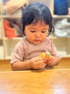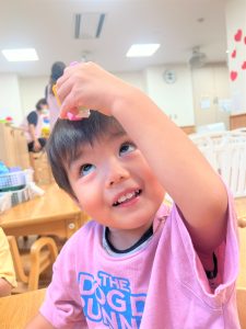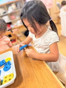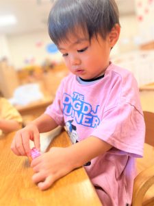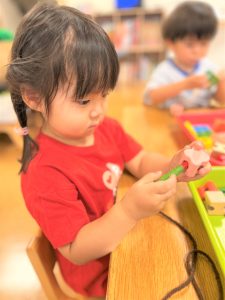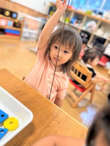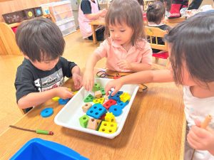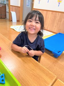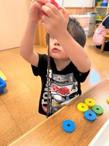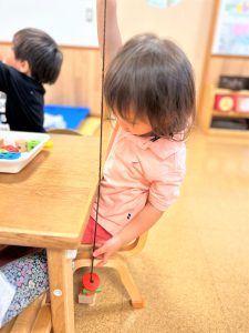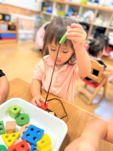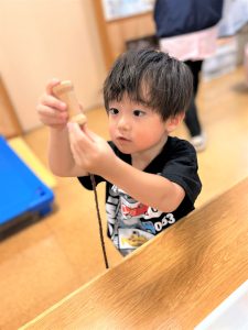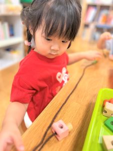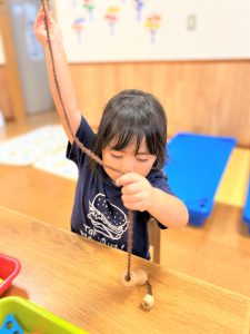 色々な形の穴の空いた木のブロックを上手に紐に通し、何度も繰り返し楽しんでいました🎶