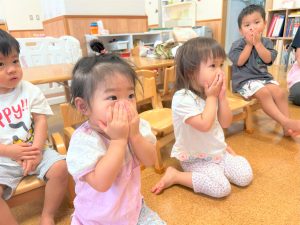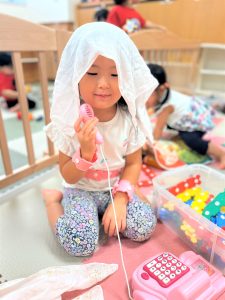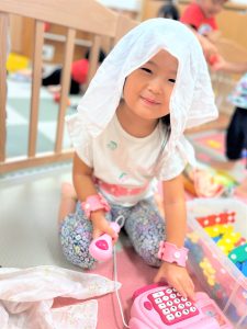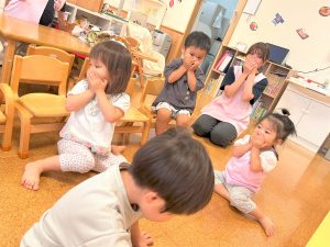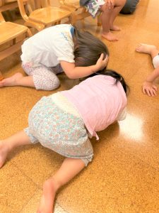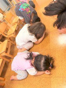 自由遊び時間は、お友だちとおままごとをしたり、防災の日には、防災の絵本を読み、地震、火事の時はどうするの?とみんなで実践し、防災訓練も行いました。