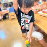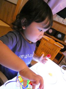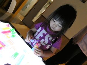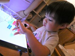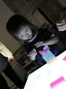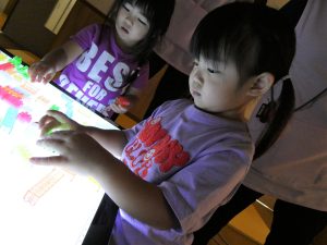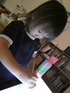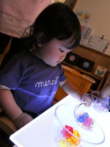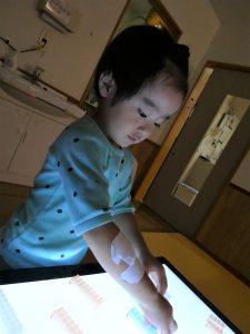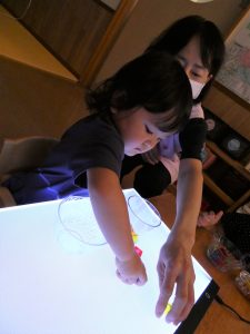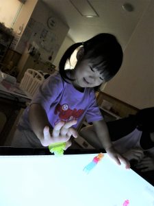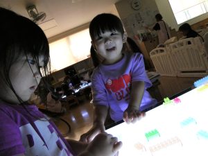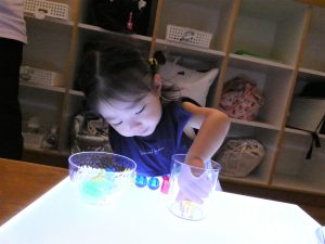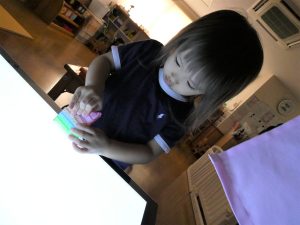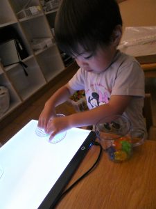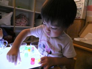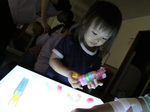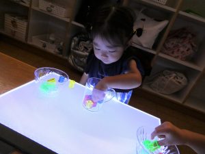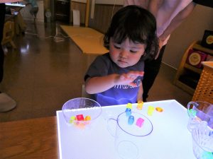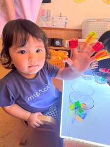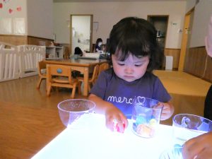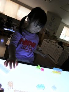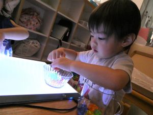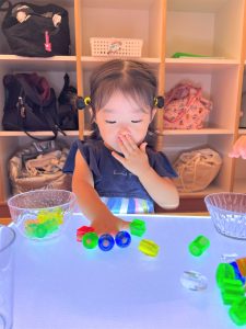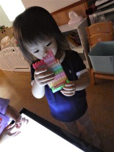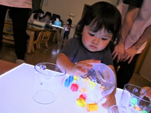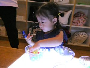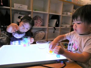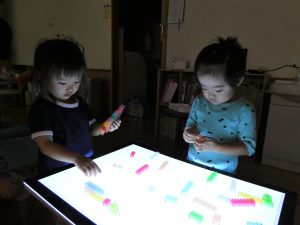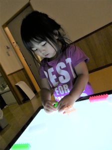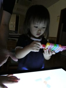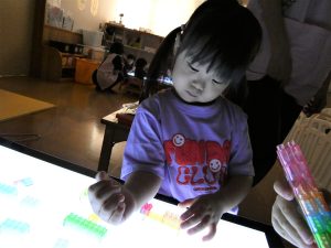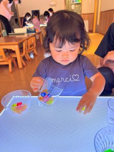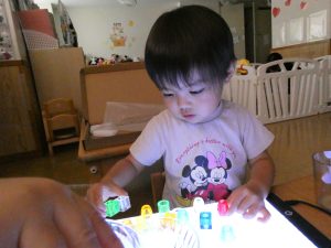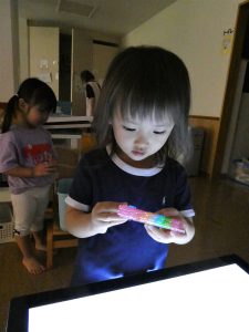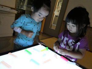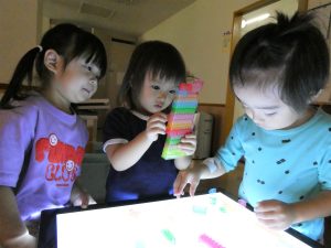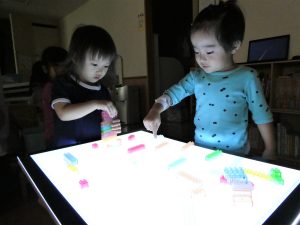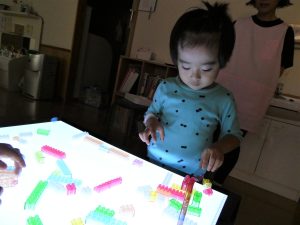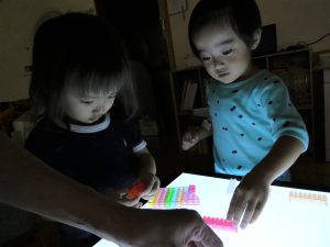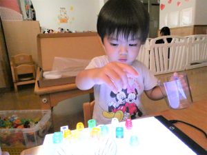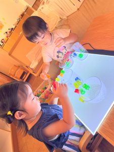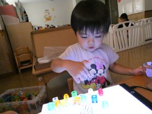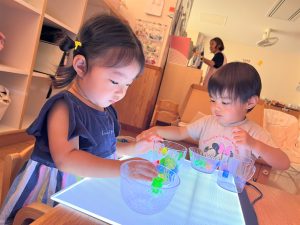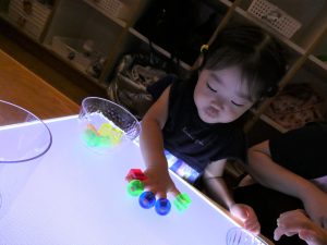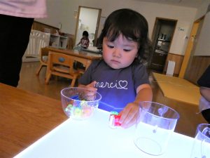 うさぎ組さんはトレース台と言われる、ライトのつく板に半透明の大きなビーズを置いて光る様子を楽しんだり、指にはめてみたり、積み重ねたりと、子どもたちなりに考えて遊びを展開していました✨30分以上集中して楽しんでいたうさぎ組さんでした😊