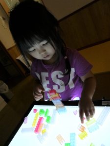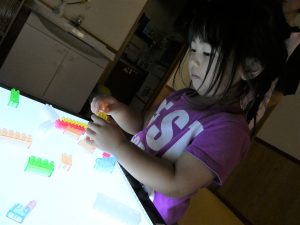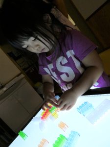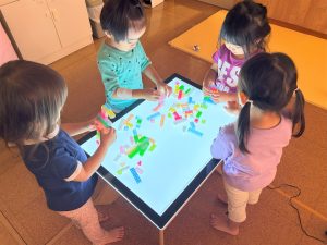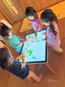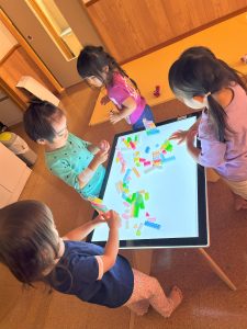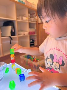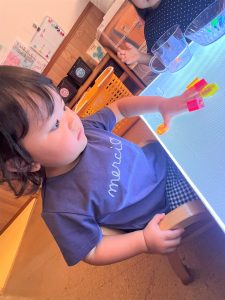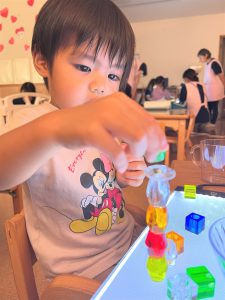 ぞう組さんは半透明のミニブロックをライトテーブルに置いて、光の反射を楽しみました。ライトテーブルのスイッチをつけると、「わぁ!!」と驚き、初めての遊びに興味津々😆お城を作ったり、迷路を作ったり、積み重ねたりと、自分たちの思い思いの遊びを展開して、ぞう組さんも30分以上集中して楽しんでいました🎶