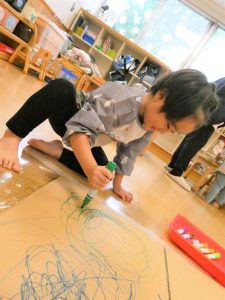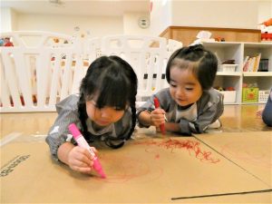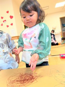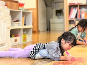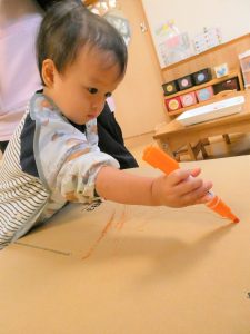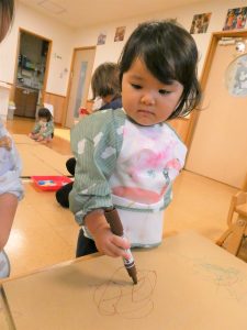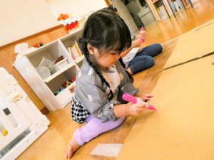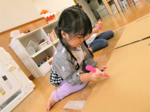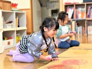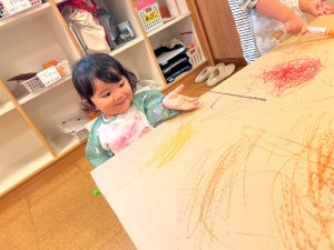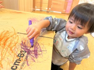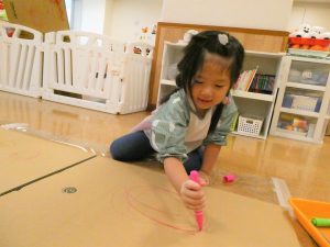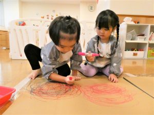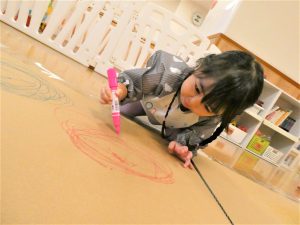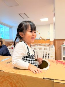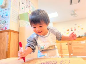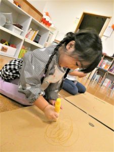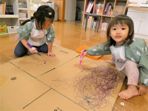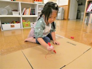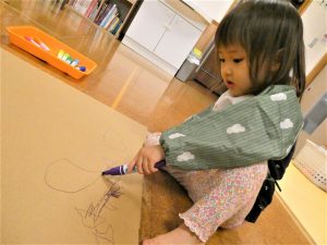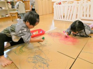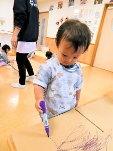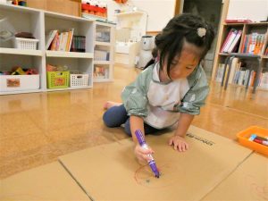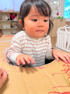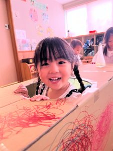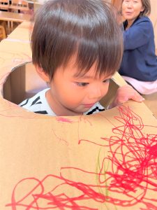 まずは大きな段ボールに自分の好きな色を選んで自由に絵を描きました🎶大きなキャンパスに大喜びの子どもたち!「うちゅうじんかいていい?」「ドキンちゃんかく!」と思い思いの絵や、色を塗り、トンネルに色づけをしていきました🖍️