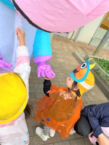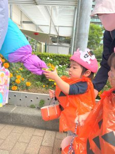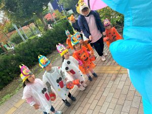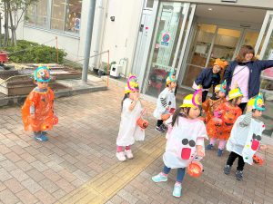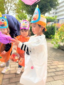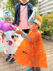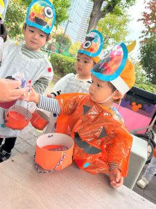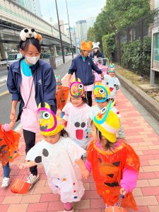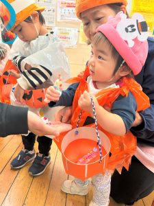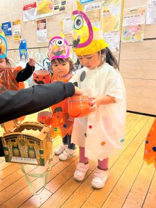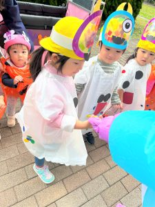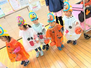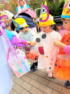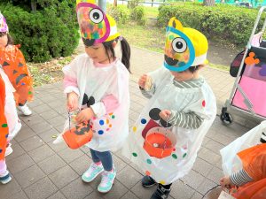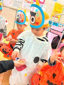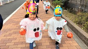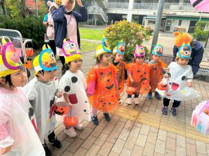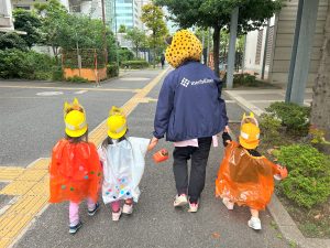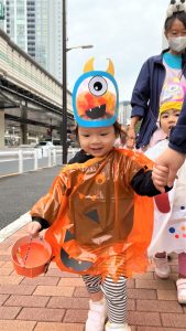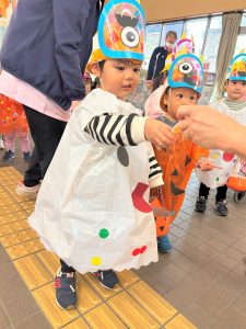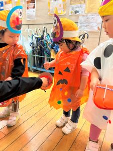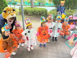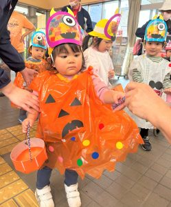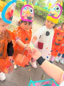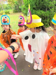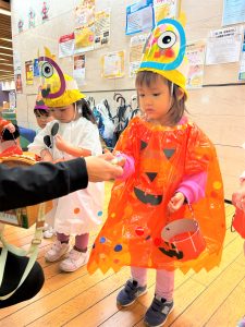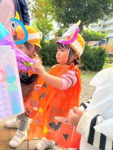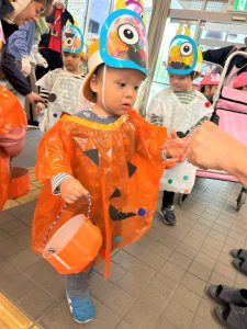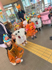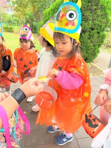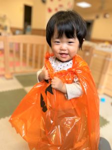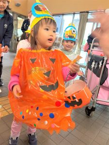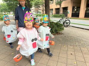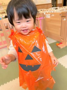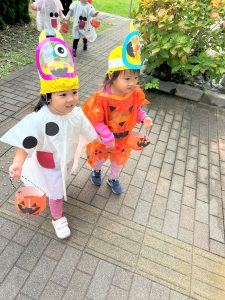 ハロウィンの合言葉「ハッピーハロウィン!」と「トリック・オア・トリート!」を覚え、すれ違う他園の園児さんや先生たちに大きい声でおはようの代わりに「ハッピーハロウィン!!」とニコニコの、ルンルンの子どもたちがとてもかわいかったです🤭