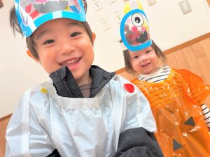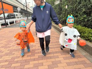 そして、いよいよ自分たちで作ったカボチャとオバケの仮装をして、頭にはモンスターのお面を被り、ハロウィンパーティーに出発です!!