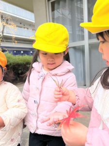 葉っぱのシャワーを楽しんだり、「これきれい!!」と葉っぱの色や、落ち葉の形を見て自分の袋に大事に入れて楽しんでいました✨