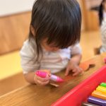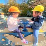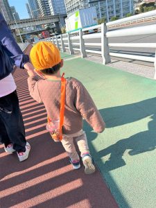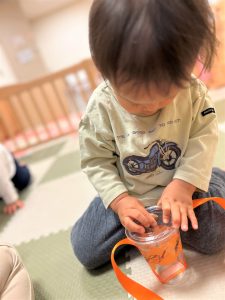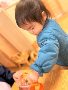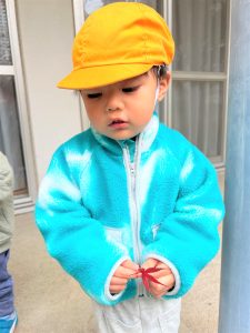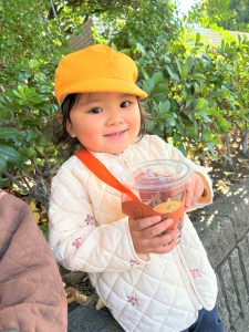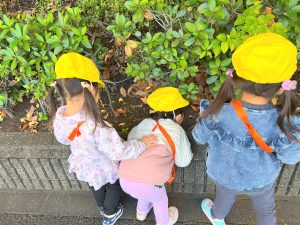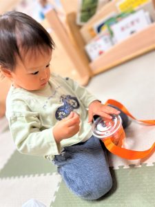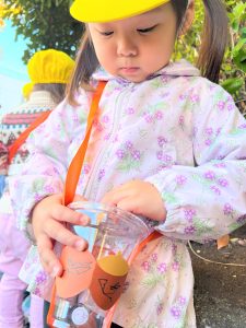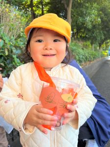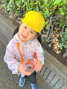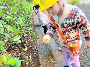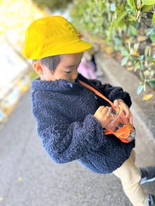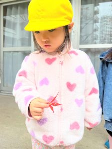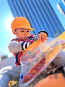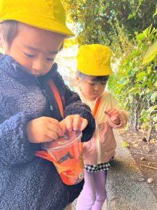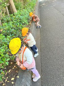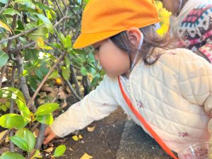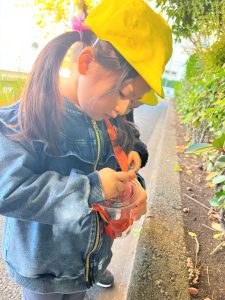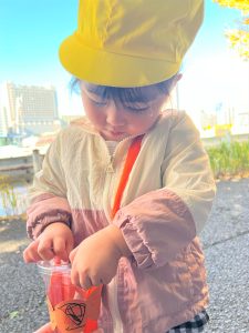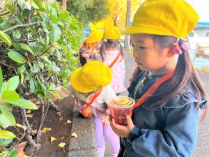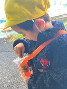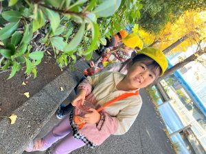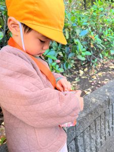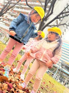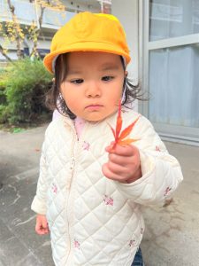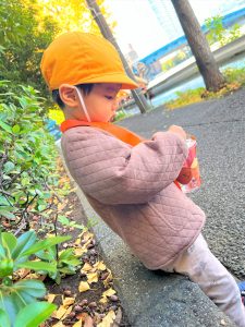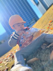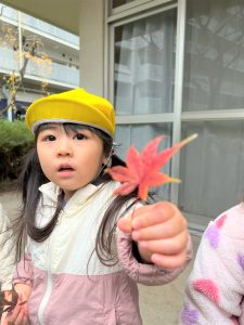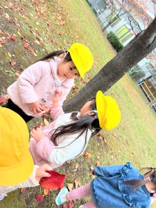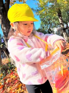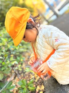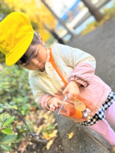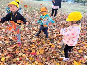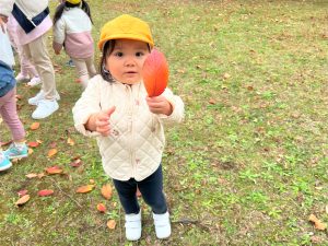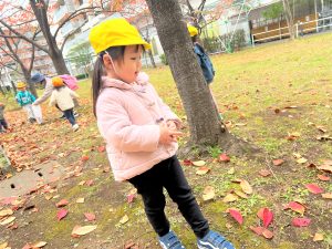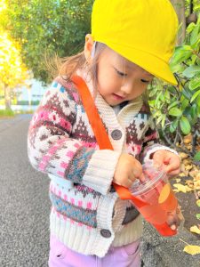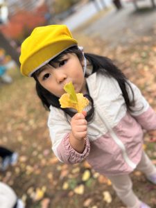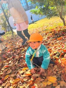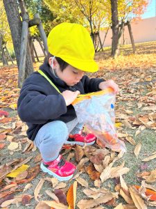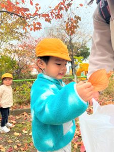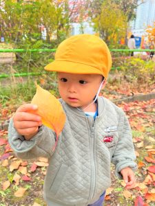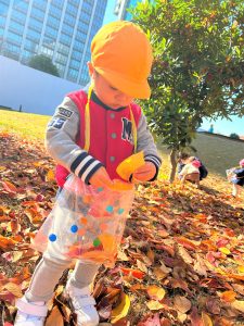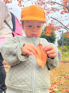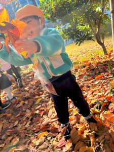 葉っぱのシャワーを楽しんだり、「これきれい!!」と葉っぱの色や、落ち葉の形を見て自分の袋に大事に入れて楽しんでいました✨