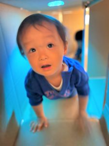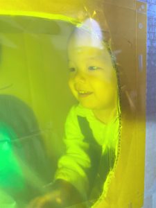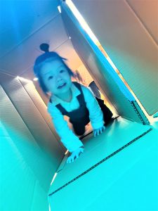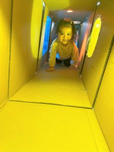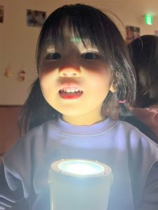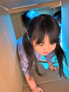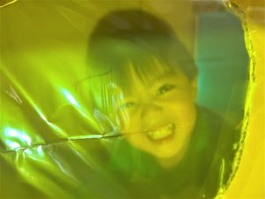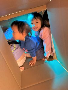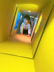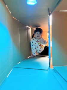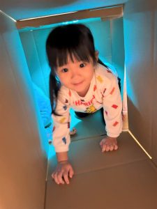 11月のすくわくプログラムは10月のトンネル遊びの続きとして、抜け道を作ったり、トンネルをカーブさせたり、スズランテープのカーテンを付けて、さらにはトンネルの中にも光の色を付けて遊びました✨
