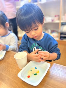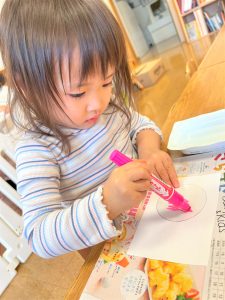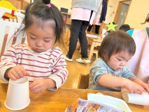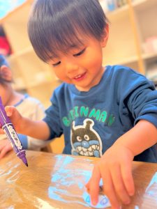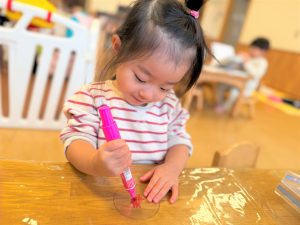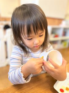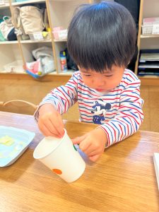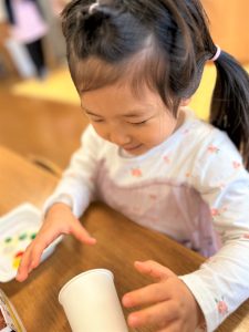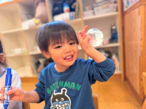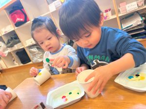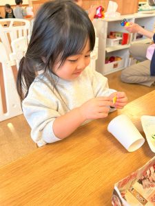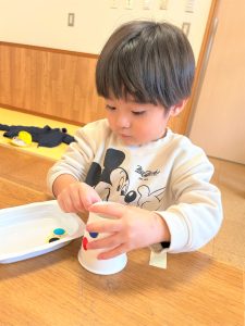 ラミネートに好きな色を塗ったり、紙コップに丸シールを付けたり、自分だけの光シアターを作りました✨