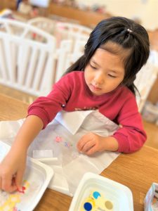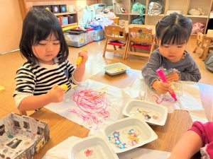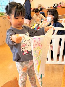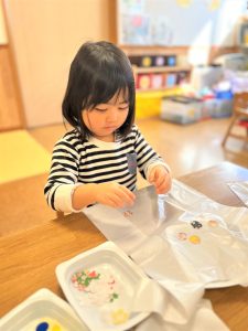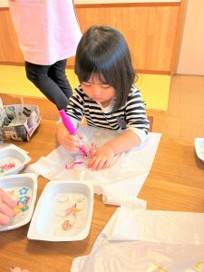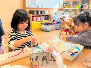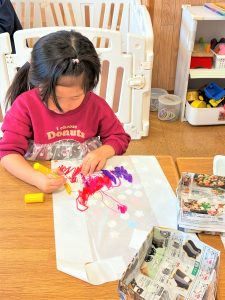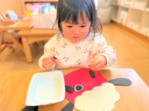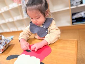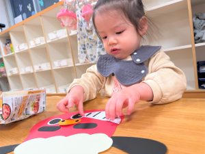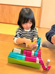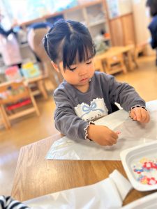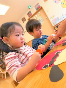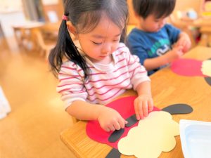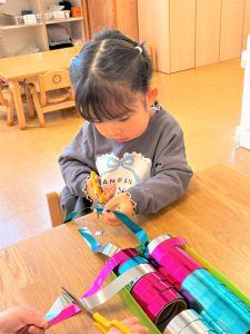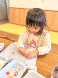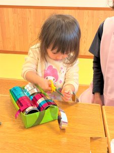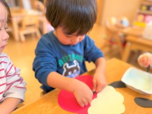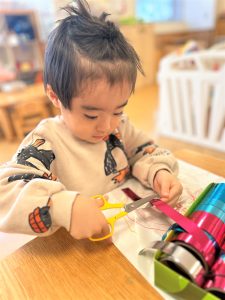 今回は初めてハサミを使いました✂️持ち方や切り方を一緒に行い、二回目からは自分で上手に切ることが出来て驚きました😯