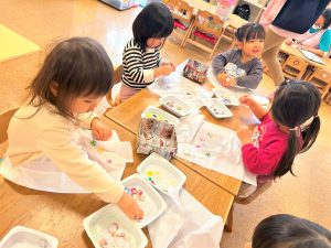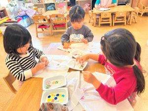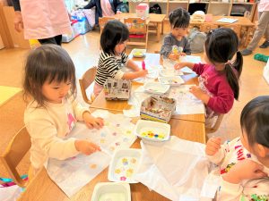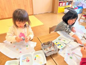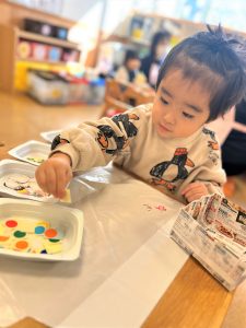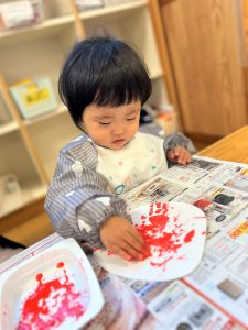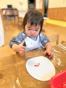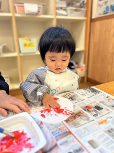 ひよこ組はだるまのおきあがりこぼしを作りました。手で絵の具をペタペタとだるまの色を付けました🎨