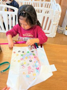 ぞう組さんは凧を作りました!和風の折り紙シールや丸シールを貼ったり、好きな絵を描きました☆