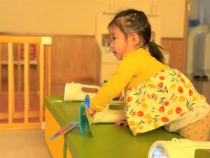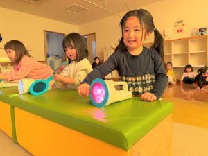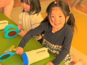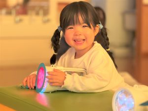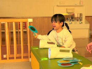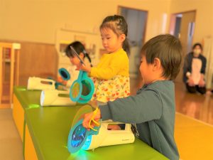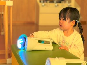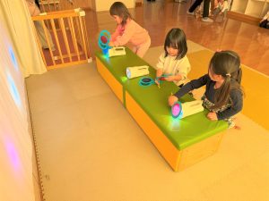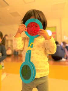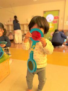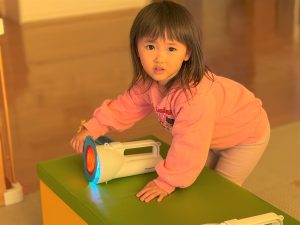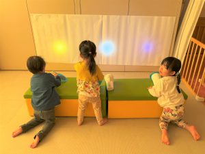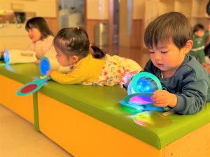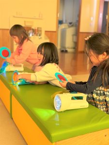 2026.03.09 ブログ 2026年1月 すくわくプログラム⑥ 1月のすくわくプログラムは色のついた虫メガネを懐中電灯にかざし、壁に貼った白い模造紙にどう映るかを、自分たちで好きな色を照らして遊びました✨ 単色で見たり、色を重ねてみたり、ひよこ組さんは自分の顔に当てて楽しんでいました🎶 記事一覧へ戻る