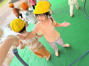 シャワーの雨で大喜びの子どもたち!寝転がったり、タープにタッチして雨を降らしたり、大盛り上がりでした😆