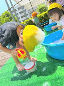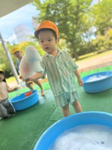 泡あそびも楽しみました😄ふわふわの泡に大喜びの子どもたちです♪