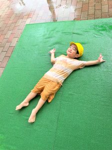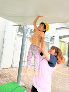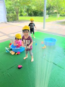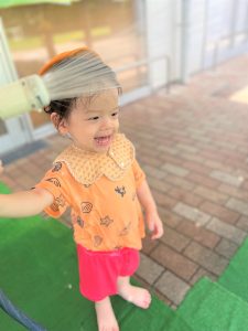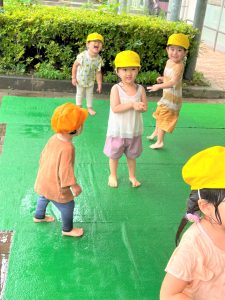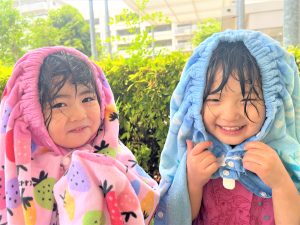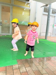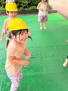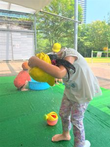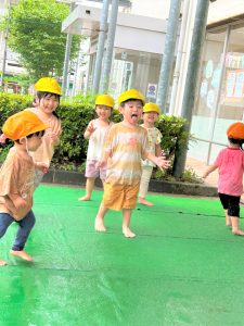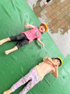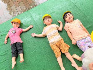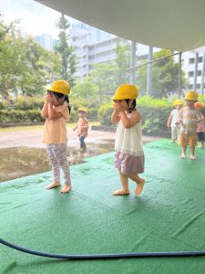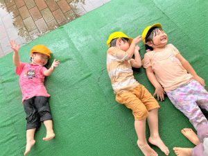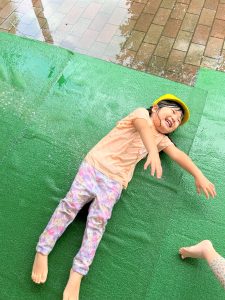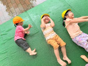 シャワーの雨で大喜びの子どもたち!寝転がったり、タープにタッチして雨を降らしたり、大盛り上がりでした😆