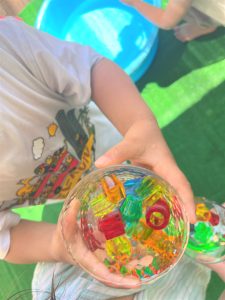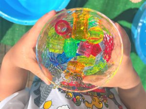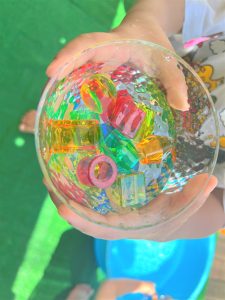 また違う日には、宝石みたいなキラキラした大きなビーズを空にかざしてみたり、水に入れてみたり、透明な入れ物に入れて、お日様の下に置くと、「きれい!!!!」とキラキラ光る様子を楽しんでいました✨