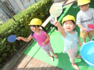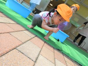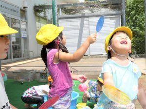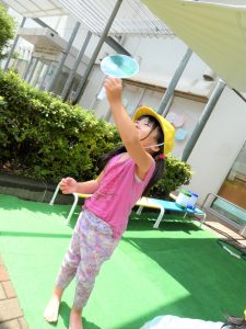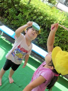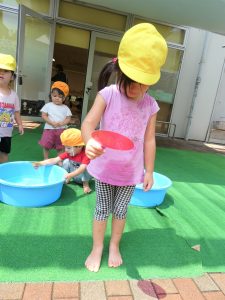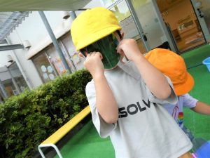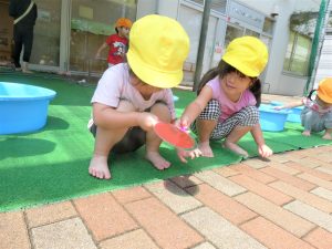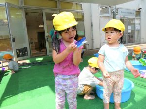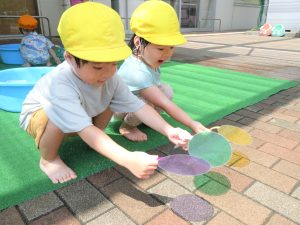 水遊び中にすくわくプログラムの一環として、「光と色」をテーマに色セロハンの虫メガネを使って、