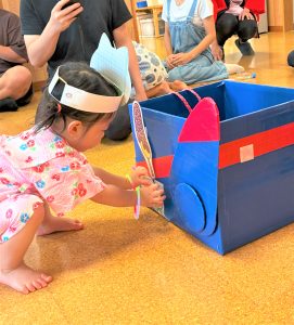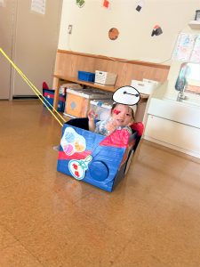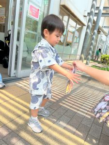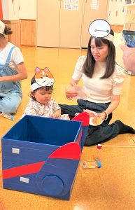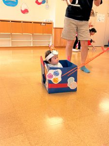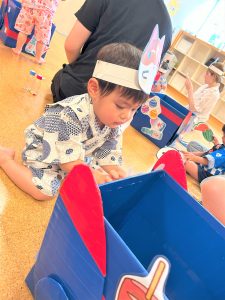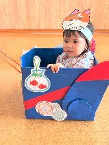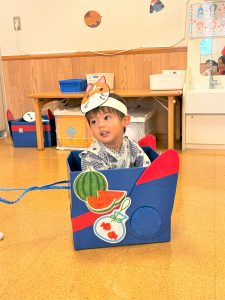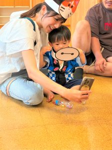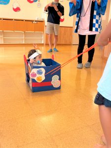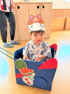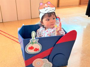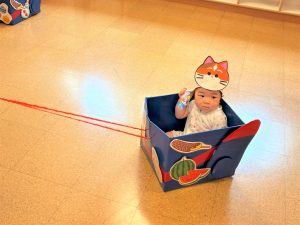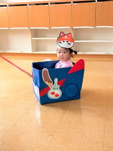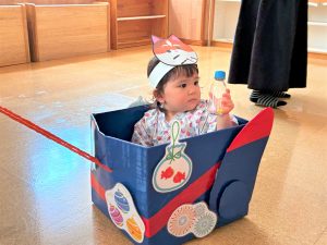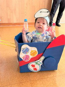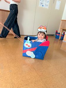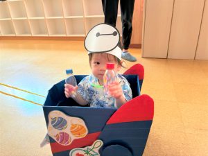 ひよこ組さんはお面をかぶってスタートし、ベイマックスのライド型の山車に乗って、お父さんやお母さん、お兄ちゃんに引っ張ってもらい、音楽に合わせてマラカスを振りました🎶