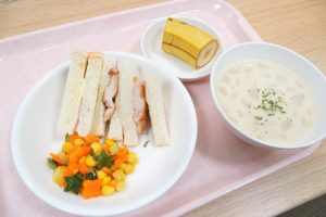 お昼ごごはんは、ハムチーズと照焼きチキンのサンドイッチ🥪サラダも星形や花形になっていて、とてもかわいかったです🌟