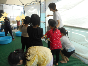 そんな中、先日水遊び&プール遊びを開始しました。プールはお天気の関係でまだ実施できていませんが、タライを使った水遊びでは水の心地よさを感じながら、楽しそうに遊ぶこどもたちの姿がありました。