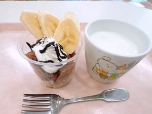 おやつはココアバナナパフェ。お誕生児も大好きなバナナをのせてくれました。