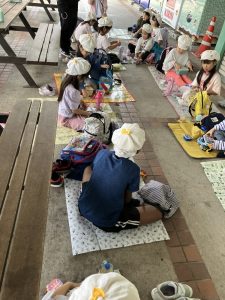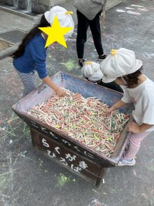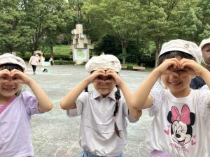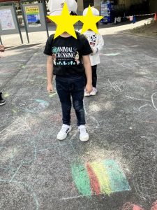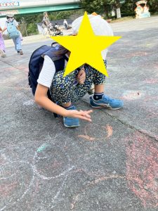 最後は地面にらくがきを楽しんできました。思う存分好きなところに絵を描くことも、チョークを扱うことも良い経験になりました。