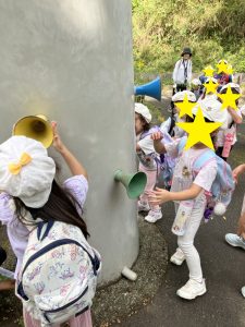 ドキドキの森の先にはなんと不思議なオブジェが。色分けされた伝声管を伝って反対側のお友達とお話ができます!
