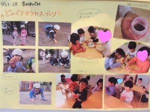 2025.11.21 ”すくわくプログラム” 3歳児クラスすみれぐみは、みんなで『音』を楽しんでいます。 秋になり公園へ行くと様々な自然の物が目に入ります。 さあ!音を探してみよう! 枯葉や木の枝、どんぐりを拾ってマラカス作り・・・と秋の自然で音を楽しみました。 記事一覧へ戻る