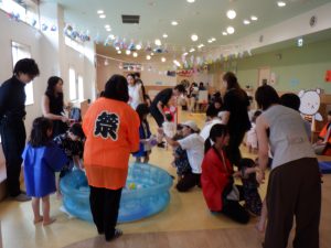 園内にこいのぼりがたくさん泳いでいます。 子どもの...