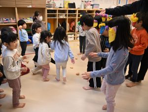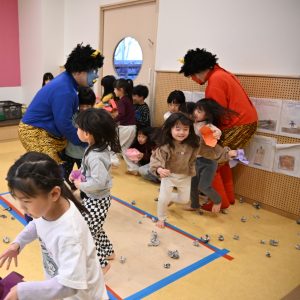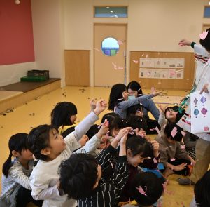 2026.02.25 アルバム 節分 今年の節分は年長さんが鬼になり、乳児クラスにいきました。 乳児クラスの子どもたちは、鬼を退治しようと手作りの豆をまいて、上手に鬼を退治することができました。 幼児クラスの節分では本物の鬼がきて、大騒ぎ・・・たくさん豆をまいて、鬼を退治しました。 「泣き虫鬼」「好き嫌い鬼」「いじわる鬼」自分の心の中の鬼をやっつけて、春の幸せを呼ぶ行事を楽しみました。 おやつでは恵方巻をみんなで食べました。みんながよい一年を過ごせますように…☆彡 記事一覧へ戻る