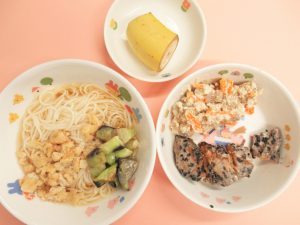 給食のときには、目の前でみんなが叩いてくれたきゅうりと調味料を混ぜ合わせるところを見てもらいました。