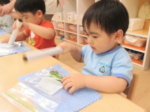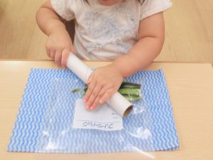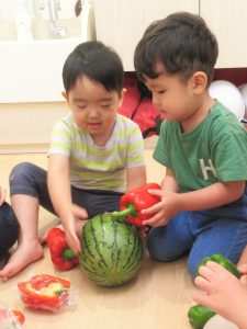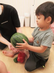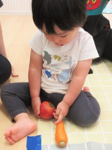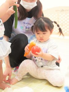お気に入りの野菜を見つけて大事そうに触ったりぎゅっと握りしめたり、それぞれのペースで楽しんでいました。