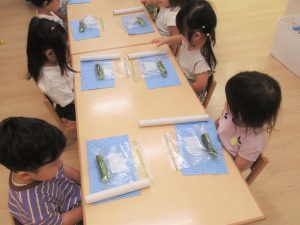 きゅうりが苦手な子も、「みんなで作ったきゅうりだよ」と伝えると自分から挑戦する姿がみられ、こあらぐみさん全員がきゅうりをおいしく食べることができましたよ。