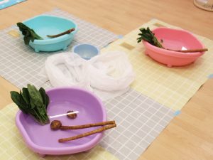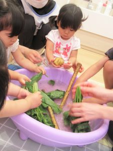 前回は触れることを中心とした食育でしたが、今回はステップアップしてタライを使って野菜を洗ってもらいました。