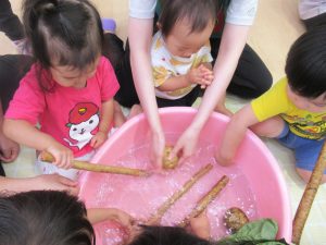 はじめは恐る恐る触る様子の子どもたちでしたが、きりんぐみさんの見本を見ながら慣れていき、終わる頃にはみんな真剣に野菜を洗っていましたよ。