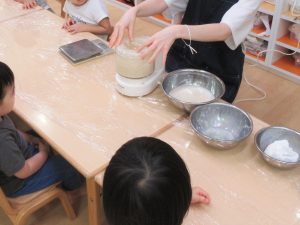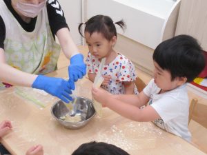 袋の中に入ったバナナをつぶしてもらうと「バナナの香りがする~」「おいしくできるかな?」と会話をしながらとても上手にバナナをつぶしてくれました。