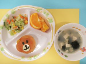 当日の給食は、生野菜を使用せずに缶詰や乾物を使い、幼児クラスでは普段のお米をアルファ化米に置き換えて防災食を意識したものを提供しました。