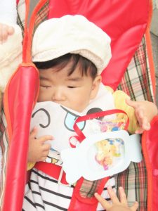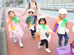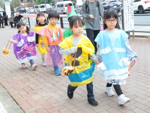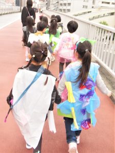 先生たちが手作りした衣装を身に着けて商店街を周りました。