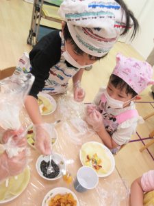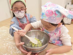 裏ごし作業では友だちと協力し合い、トッピングも譲り合いながら楽しそうに行うことができました。