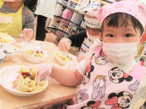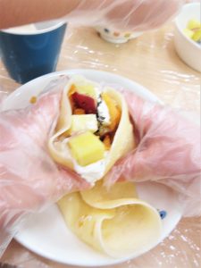 みんなが頑張って切ってくれたさつまいもをキッチンで甘露煮にして、おやつの時間にさつまいもクレープづくりを行いました。