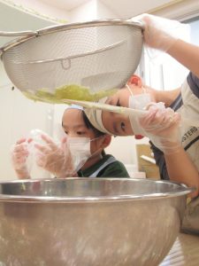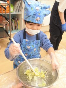 子どもたちにはさつまいもの裏ごしをしてらいました。