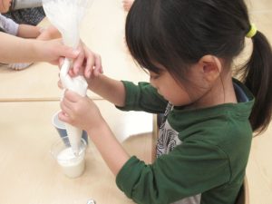 その後キッチンで材料を混ぜて、できあがったドリンクに子どもたちがホイップクリームとフレークをのせて完成です。