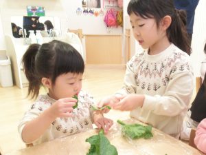 きりんぐみに手伝ってもらいながらりすぐみは小松菜ちぎり、こあらぐみはきのこほぐしに挑戦です。