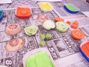 旬の野菜を使った野菜スタンプと、様々な野菜の『断面クイズ』を行いました。