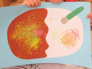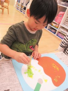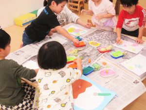 野菜スタンプでは、『チンゲン菜・れんこん・小松菜・にんじん・えのき』に絵の具をつけて画用紙の中のカレーライスにぺったんぺったんと自由にスタンプ。オリジナル野菜カレーの完成です!
