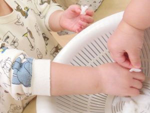 「こうやってつぶすんだよ」と伝えると、真似をして「もみもみ」と言いながら楽しそうにつぶしてくれました。