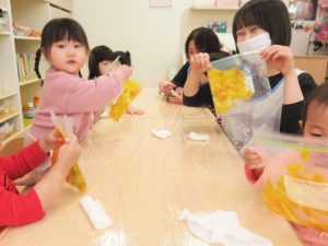 米粉に塩・片栗粉・水を混ぜた生地をジッパー袋に入れて子どもたちに渡すと、もみもみしたり踏んだり・・・